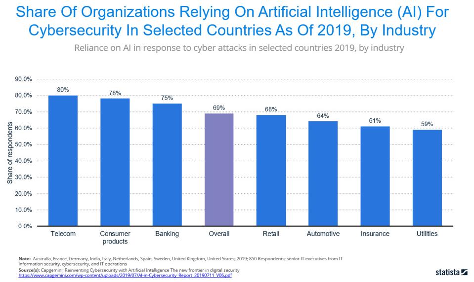 Die Mehrheit der Cybersicherheitsteams ist heute überfordert, Sicherheitsprotokolle zu analysieren, Breach-Versuche zu vereiteln, potenzielle Betrugsvorfälle zu untersuchen und vieles mehr. 69% der Führungskräfte glauben, dass KI und maschinelles Lernen notwendig sind, um auf Cyberangriffe zu reagieren Capgemini-Studie, Cybersicherheit mit künstlicher Intelligenz neu zu erfinden. Die folgende Grafik vergleicht den Prozentsatz der Unternehmen nach Branchen, die sich auf KI verlassen, um ihre Cybersicherheit zu verbessern., 80% der Führungskräfte in der Telekommunikation glauben, dass ihre Organisation ohne KI nicht auf Cyberangriffe reagieren kann, wobei der Durchschnitt 69% aller Unternehmen in sieben Branchen beträgt.