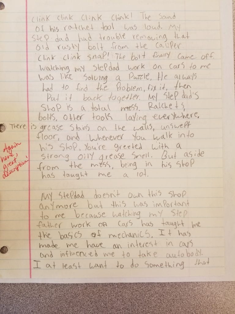las viñetas están destinadas a ser cortas, así que a medida que avanzamos en la fase de revisión, estas palabras de Thomas Jefferson se convierten en nuestro mantra: «el más valioso de todos los talentos nunca es usar dos palabras cuando una lo hará.»Los estudiantes trabajan juntos para cortar cualquier palabra u oración que no describa claramente la escena o ayude a crear el estado de ánimo. Uso mi propia escritura y dejo que los estudiantes la revisen para ganar su confianza., Si estoy confiando en ellos para escuchar mis pensamientos y ayudar a mejorar mi escritura, espero que confíen en mí para hacer lo mismo.
